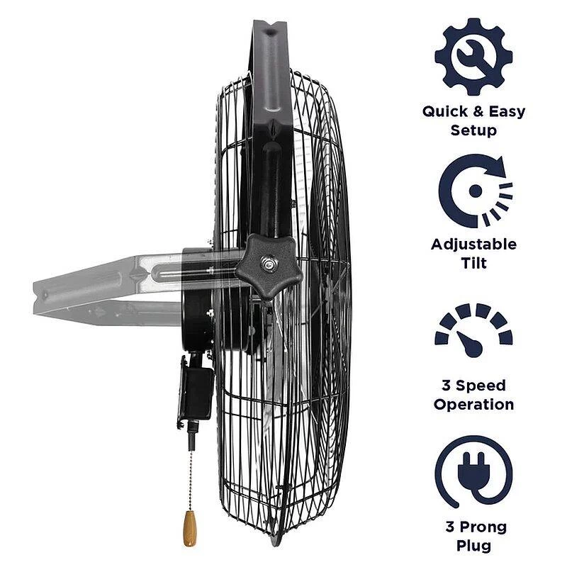 The Maxx Air 18-inch High Velocity Wall Mount Fan is a low maintenance and reliable solution for a workshop, commercial or home garage, barn, industrial factory or warehouse, greenhouse, gym, and other indoor rooms where floor space is limited or when overhead circulation is required. This electric wall mounted fan is built tough with a totally enclosed motor, making it safe for use in dusty environments where other fans may fall short. Fully assembled with a powder-coated steel construction in black finish and a heavy-duty hanging bar that makes for a stress-free, safe installation. The fan head tilts up to 180-degrees to direct the airflow where you need it most, and a 2-foot pull chain allows for full control of 3 cooling speeds no matter where it’s mounted.
