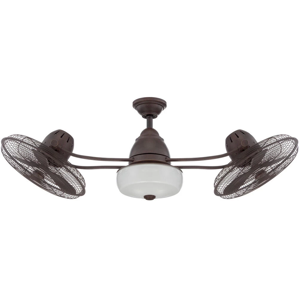Cool times II. Add retro-industrial appeal indoors or out with the dual-headed Bellows II damp-rated cage ceiling fan. Two heavy-duty, three-speed motors crank out the airflow, as twin cage fans tilt 80 degrees around the integrated, but optional, light kit. The fan also has a third motor that operates the rotation of the two motors in a 360 degree fashion. Choose from Aged Bonze Textured or Stainless Steel finishes.