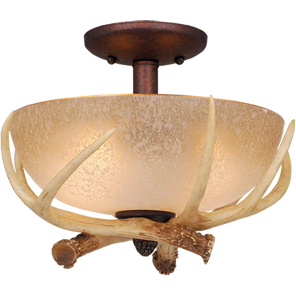 Bring a little nature indoors with the Lodge collection. Its wild look is warm and inviting yet interesting and stylish. The fixtures are designed to replicate the textural elements of pine tree bark and wood. The sculpted antlers are realistically detailed. French scavo glass shades complete the look. Everything combined makes this collection a great choice for a rustic vacation lodge, cabin or a suburban home. It will complement a variety of home styles: anywhere you want to bring in an element of nature. This versatile fixture can be installed two ways; mount as a ceiling fan light kit (check compatibility with your fan) or as a semi flush ceiling light. Pull chain on-off switch or wall switch controlled.