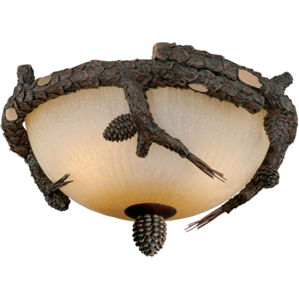 Evoking the spirit of the wilderness, this rustic themed light is clad in a realistic pine bark finish and features pine cone accents atop brushed cognac glass. It is a great choice for a vacation lodge, cabin or a suburban home and will complement a variety of home styles: anywhere you want to bring an element of nature. This versatile fixture can be installed two ways; mount as a ceiling fan light kit (check compatibility with your fan) or as a semi flush ceiling light. Pull chain on-off switch or wall switch controlled. LED bulbs (included) provides energy saving, low maintenance and long lasting performance.