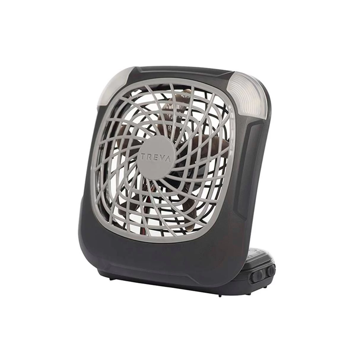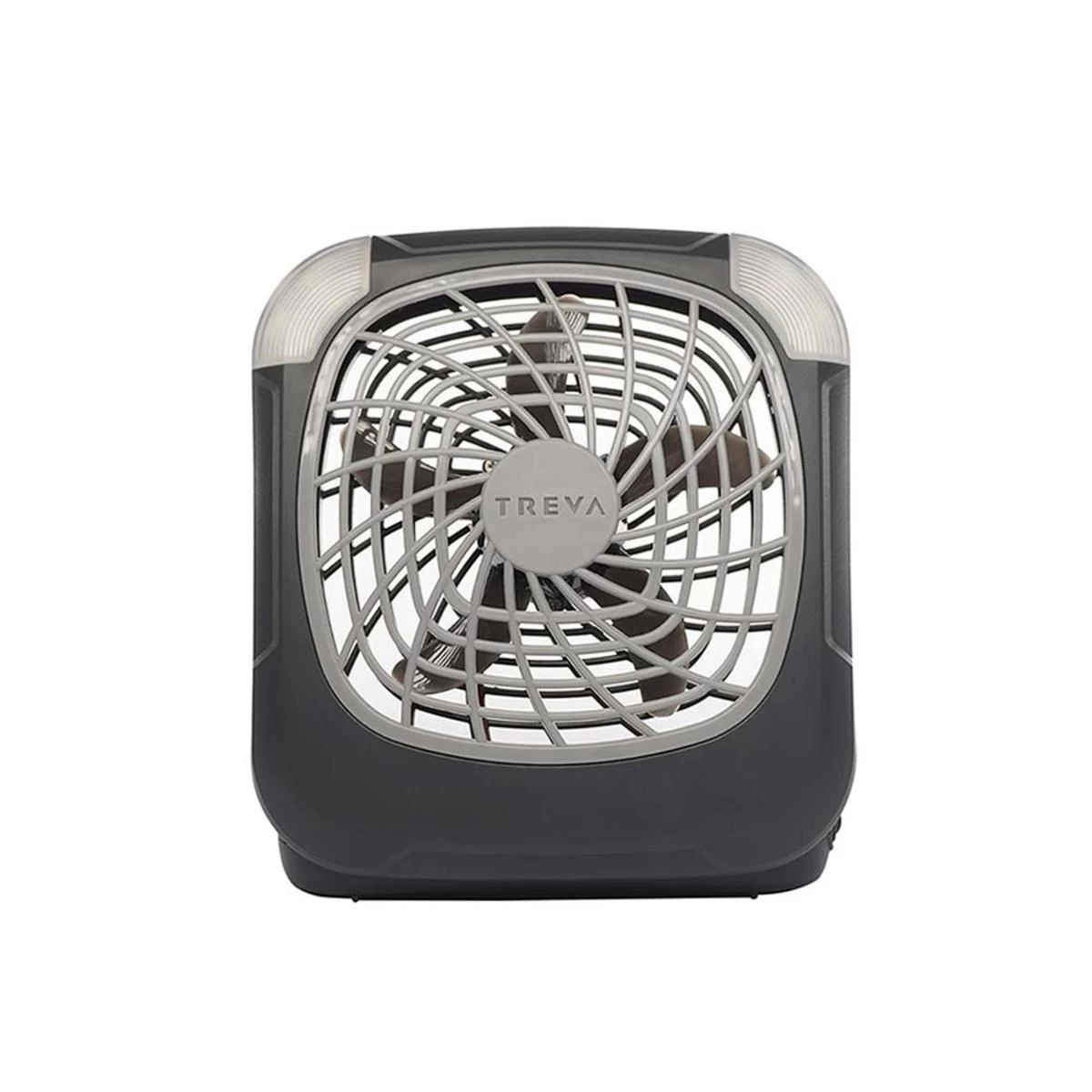 Treva’s 5 Inch Battery Powered Desk fan with Lights is perfect for indoors or out. Powerful, two-speed fan run on 4-AA batteries (not included). Patented blades allow for efficient airflow while maximizing motor life. Fan tilts for customized directional airflow. Two LED lights run independently of fan with their own on/off switch. Hook on bottom of fan can be used for hanging fan in tents or anywhere you need that extra breeze.