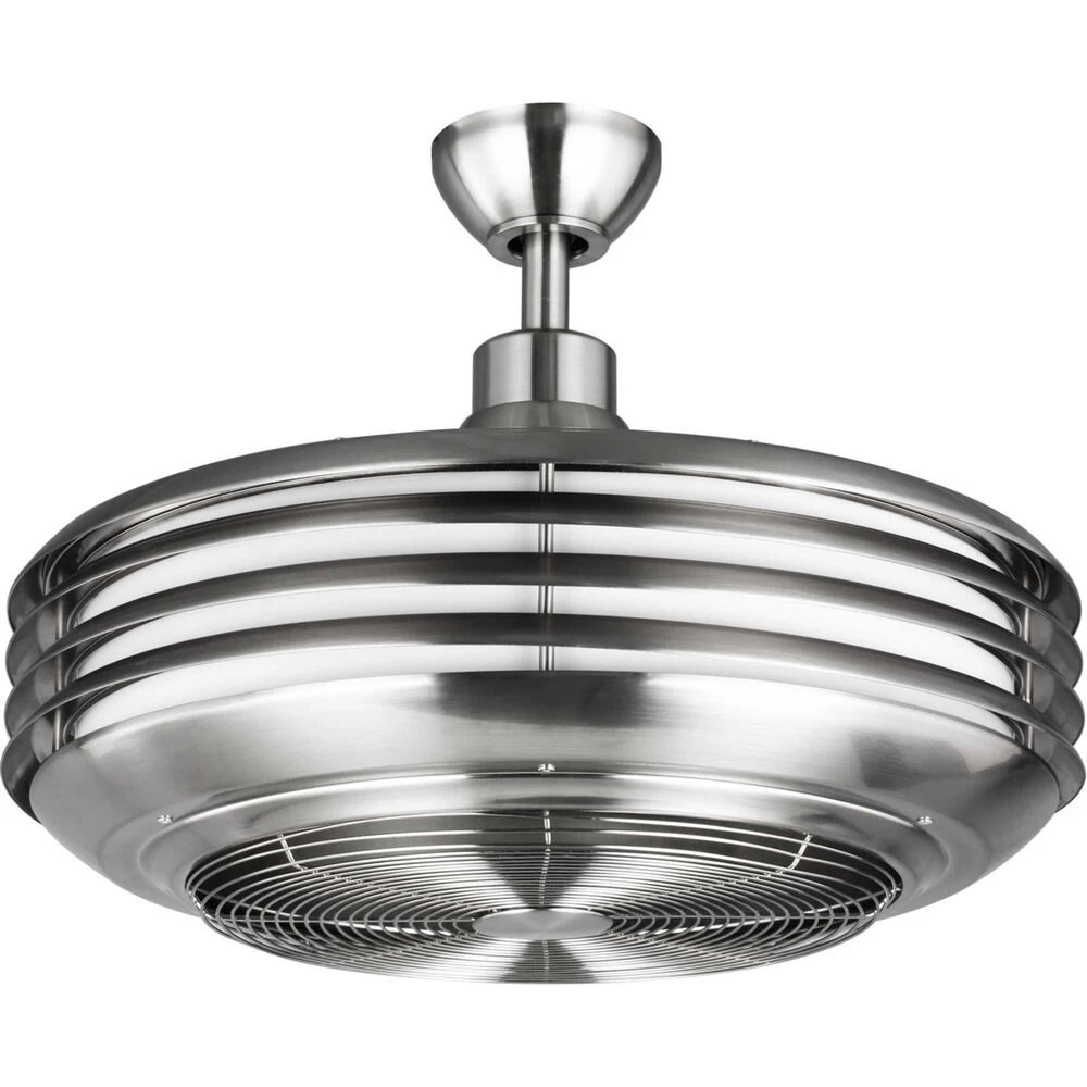 Sanford delivers ultra powerful air movement and energy efficient illumination packaged in a modern design. Ideal for both interior and outdoor settings, this fan adds a contemporary style to porches, foyers, bath and vanity areas providing a wide range of applications. Sanford includes an integrated 23W LED module, offering both form and function with energy and cost-savings benefits. Remote control included. Brushed Nickel finish with metal interior fan blades.