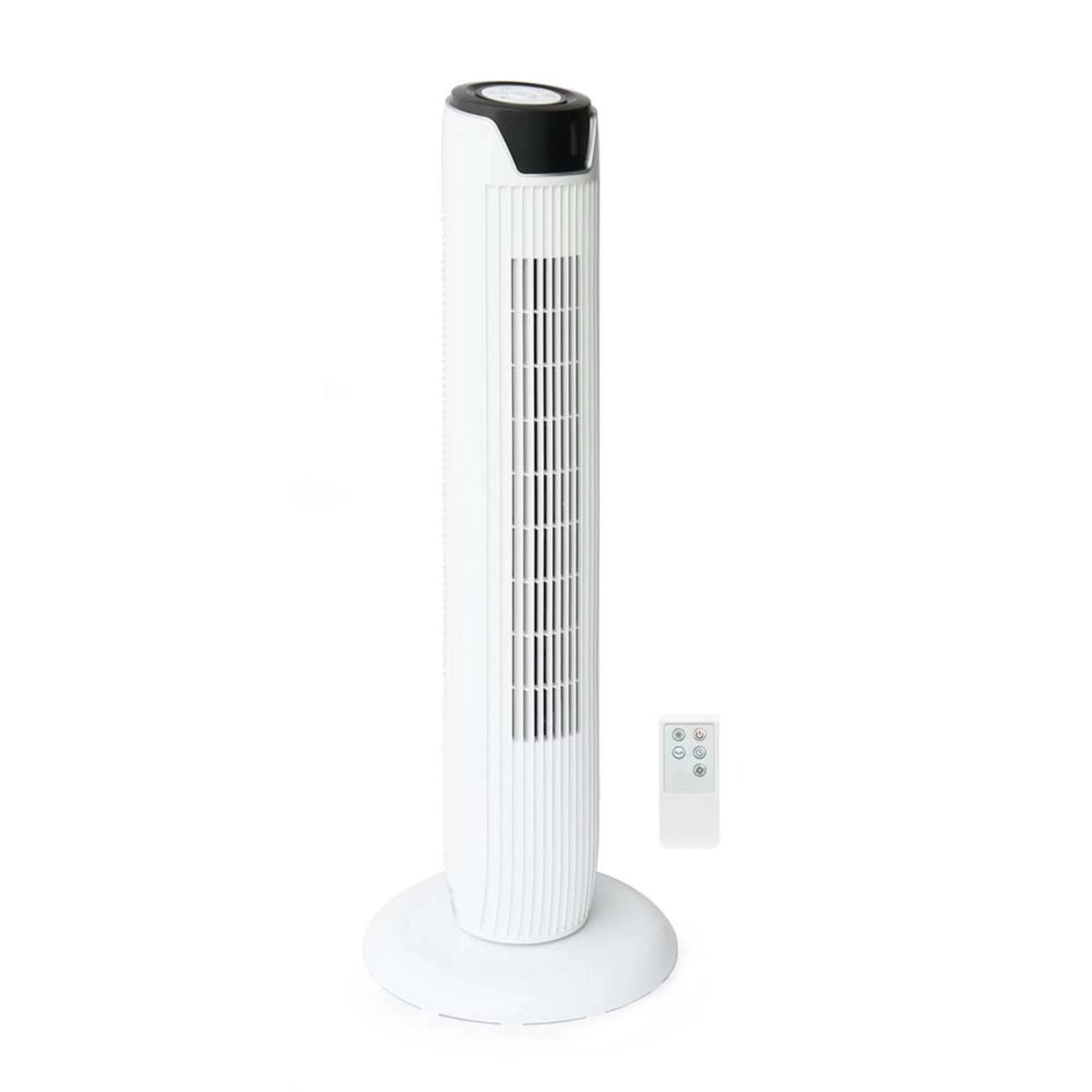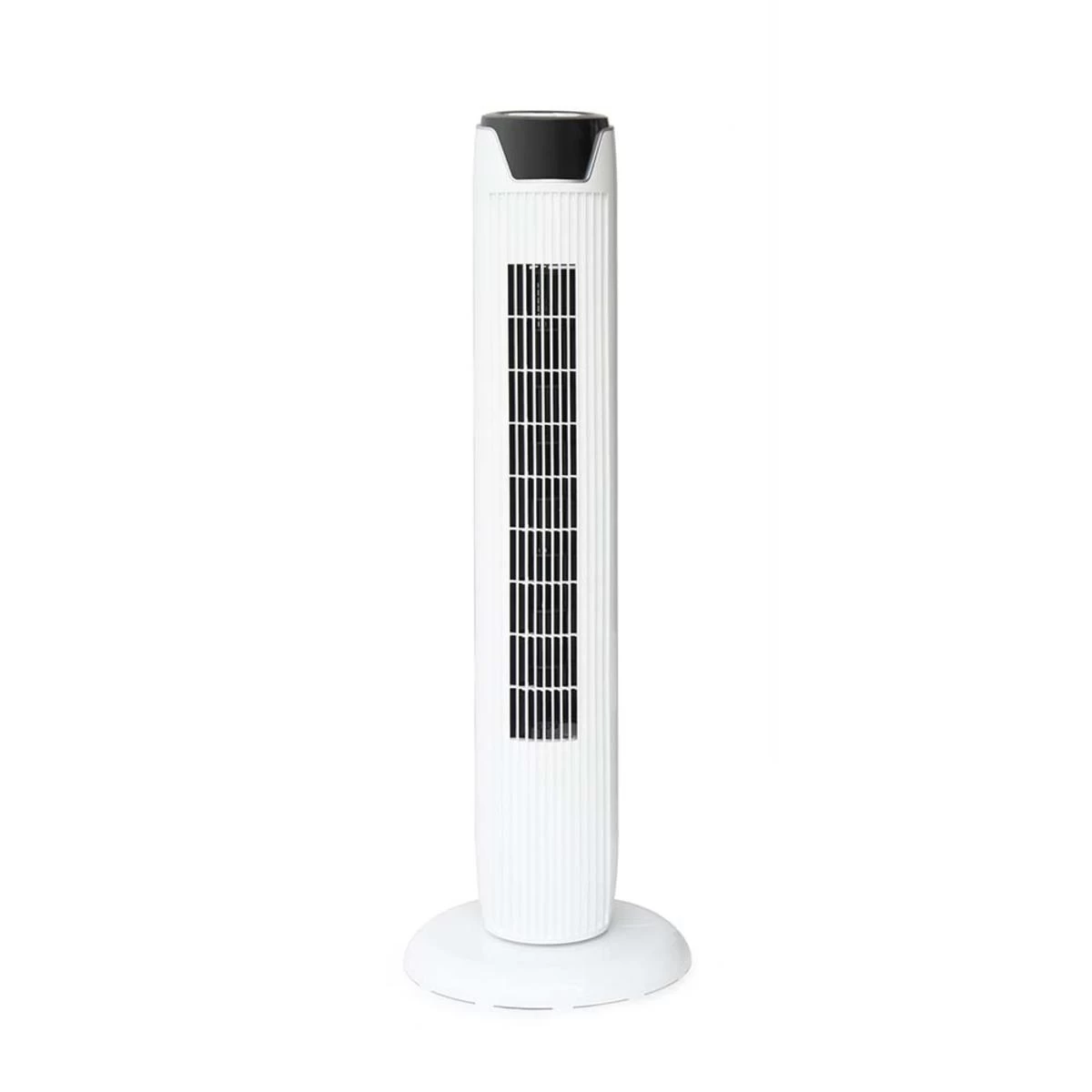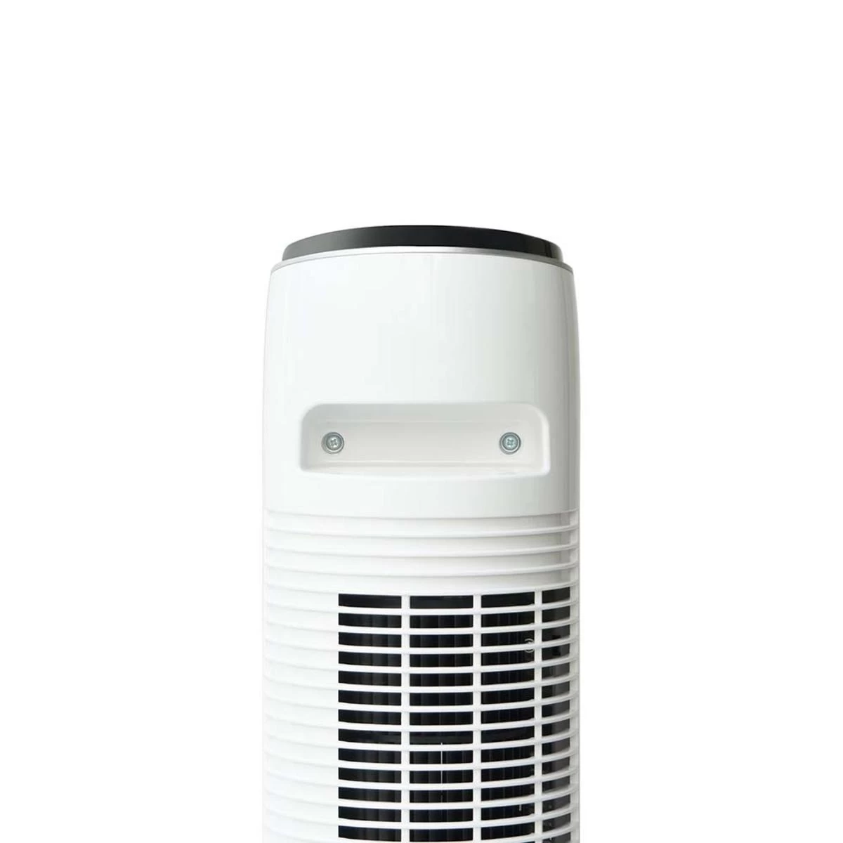 Sleek, stylish and functional. This contemporary and slim tower fan in white is perfect for room corners or small areas with its space saving footprint. Vertical spinning drum oscillates 60° for wide air distribution. Features 3 wind modes, quiet operation, LED display, remote control and auto-off timer.