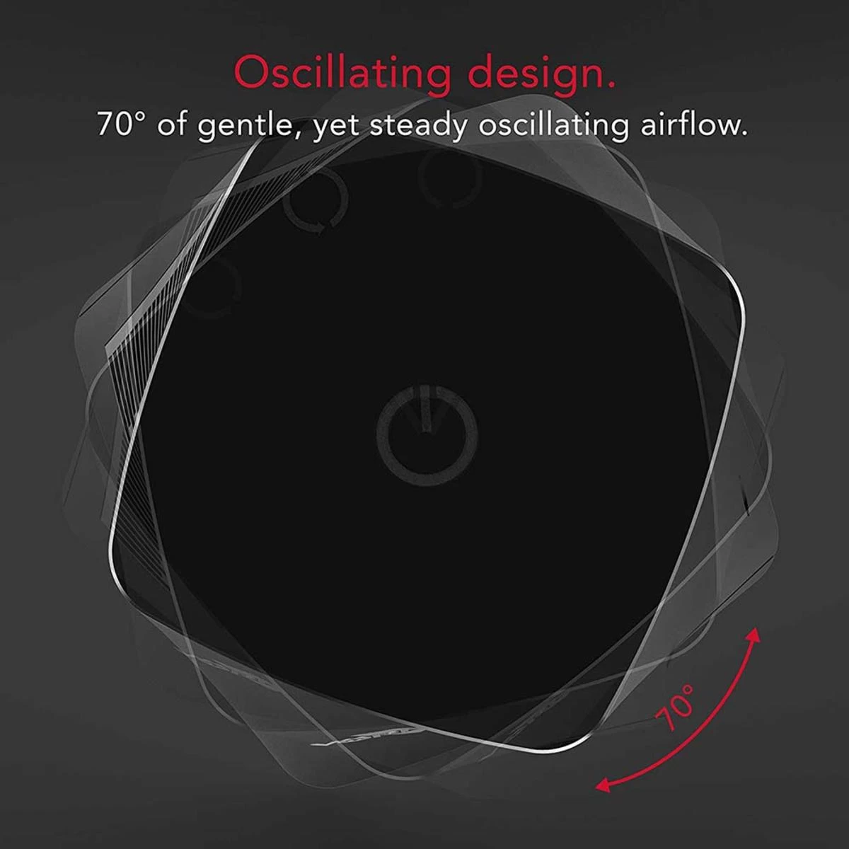 - Oscillating airflow: Unique design provides 70 degrees of gentle, yet steady oscillating airflow without disrupting your surroundings.